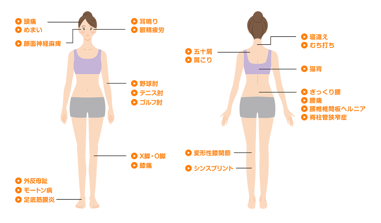 大勢の人に当てはまる施術ではなく、あなたの悩み・症状に合う施術を提供するため、幅広い施術メニューをご用意しております。